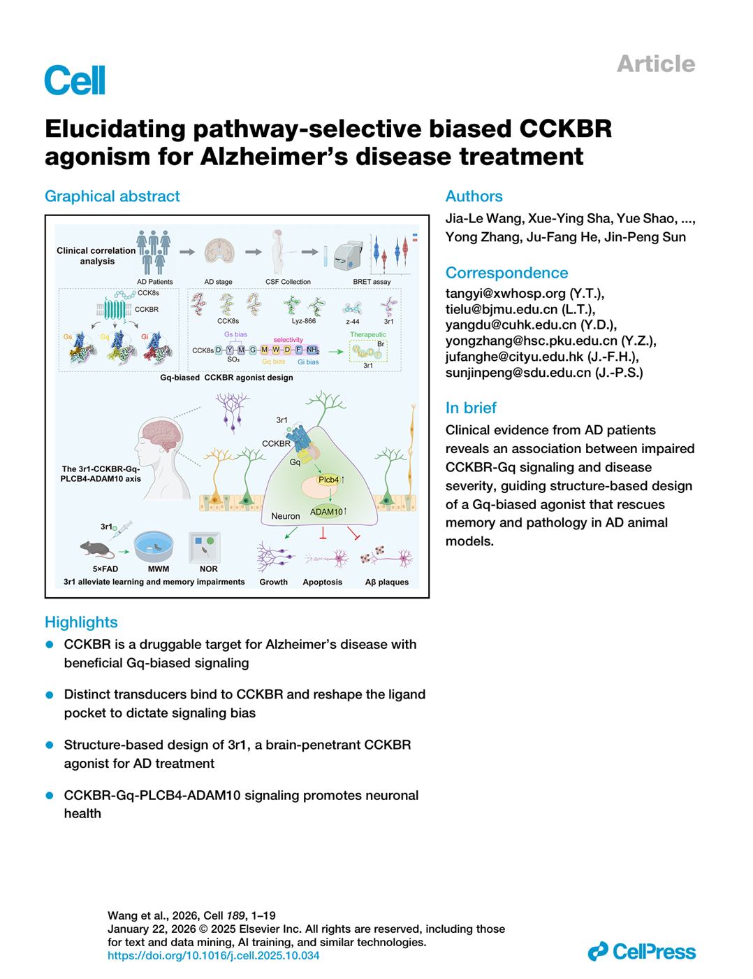 On January 22, 2026, Cell published a research paper titled “Elucidating pathway-selective biased CCKBR agonism for Alzheimer’s disease treatment.” The study was jointly completed by multiple teams, including Professor Sun Jinpeng of Shandong University, Professor He Jufang of City University of Hong Kong, and Professor Zhang Yong of Peking University. The research highlights the new therapeutic potential of the drug molecule Neu-001 (referred to as “3r1” in the paper), which was developed by the Centre for Regenerative Medicine and Health (CRMH), Hong Kong Institute of Science and Innovation, Chinese Academy of Sciences.