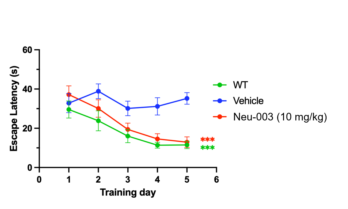 Neu-003-treated AD mice acquired spatial memory at the same rate as wild-type controls over 5 days of training (p < 0.001 vs. vehicle).
