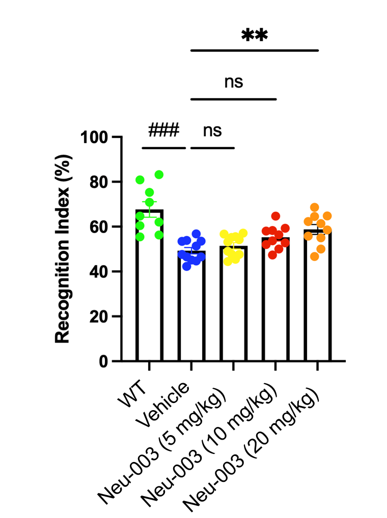 Together, these data demonstrate that Neu-003 not only enhances the biological substrate of memory at the synaptic level but also translates into meaningful cognitive improvement in a disease-relevant animal model. As an orally available agent with a novel mechanism of action, Neu-003 represents a promising therapeutic candidate poised to address the critical unmet need in Memory Deficit Syndromes.